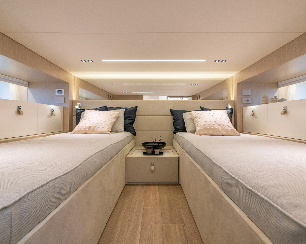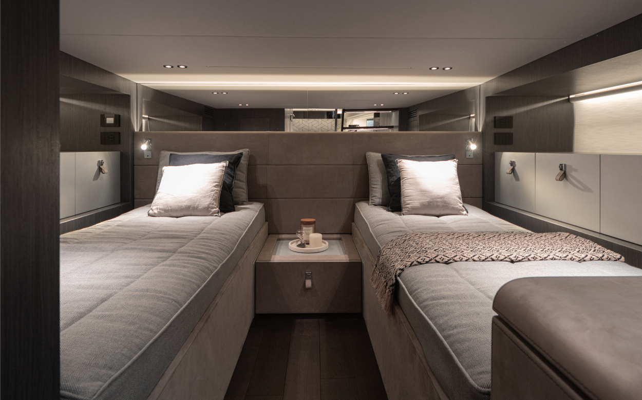- Due letti singoli con materasso in memory da 15 cm con fodera trapuntata convertibili in matrimoniale (Opt)