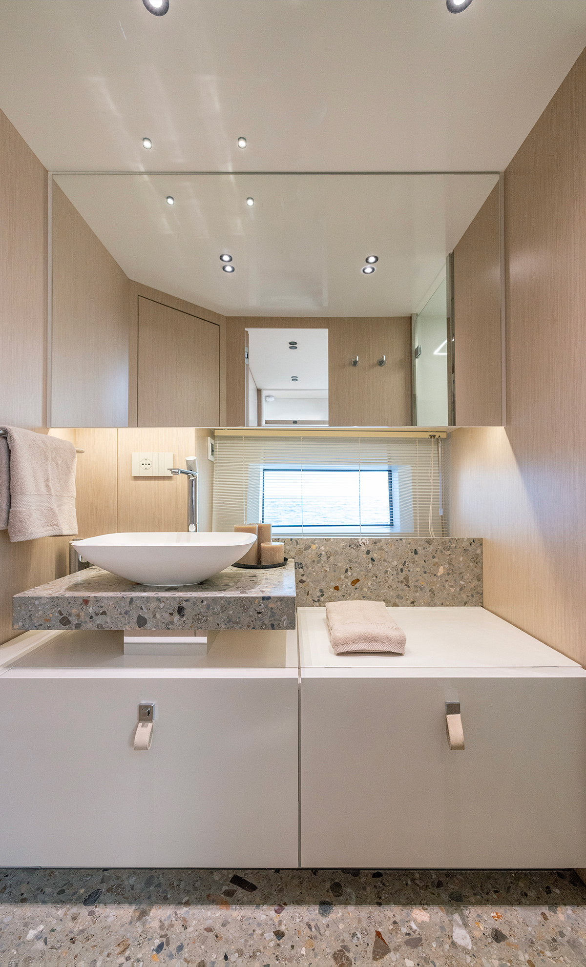 - Interni in essenza di Rovere “brezzato” con laccature e pellami bianchi