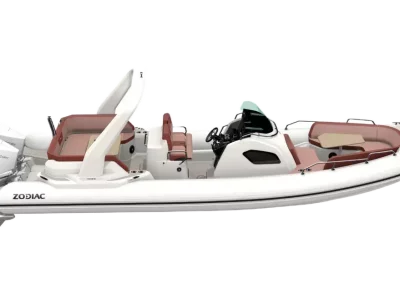 The Zodiac flagship, with its extra-large dimensions, was designed as a high-end product. Or maybe you don't feel like returning to port in the evening after a day full of emotions? How can I blame you... That's why we thought of the optional berth in the cabin! An endless relaxation area for your unforgettable days... Double saloon at the bow and stern, convertible into a sundeck, up to 14 standard seats. It has an integrated galley with sink, a console incorporating a habitable cabin with toilet (optional berth space), a three-position cushion that can accommodate up to two adults + a child and access platforms aft to the sea and a davit in the bow.